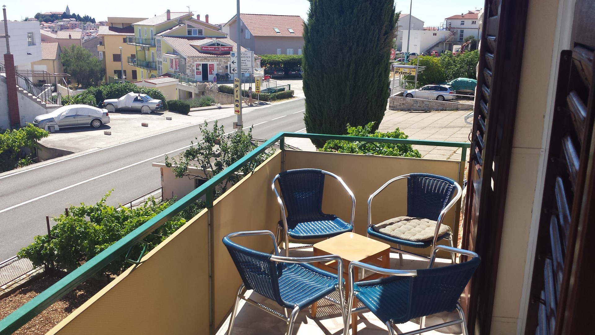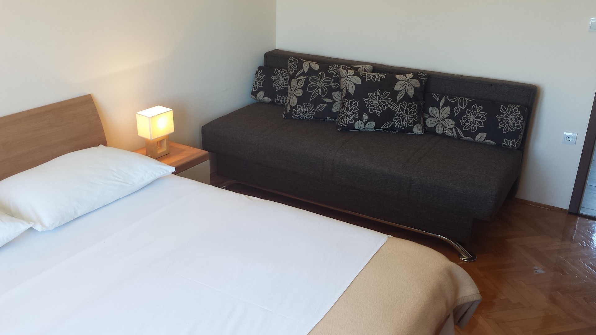 Zimmer mit Doppelbett und Einzelbett, Küche, Badezimmer mit WC, Balkon, Klimaanlage, TV, WLAN, Parkplatz