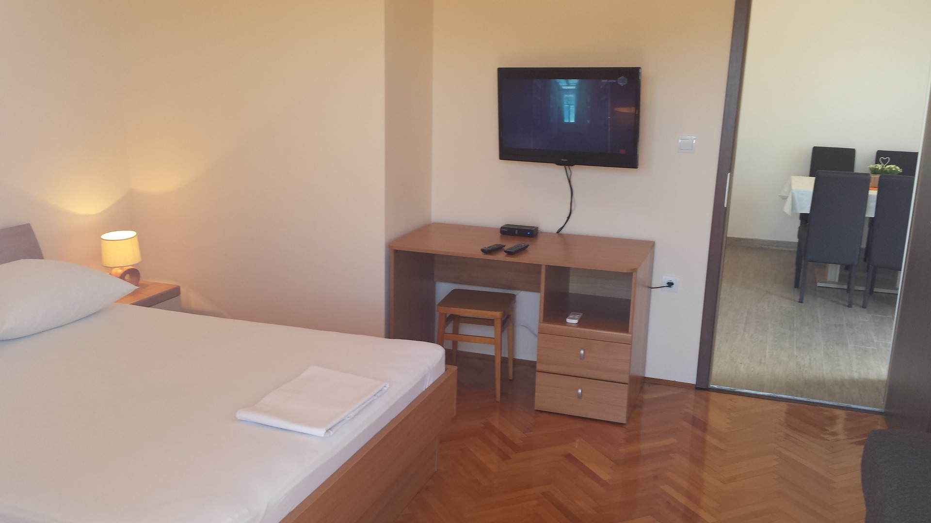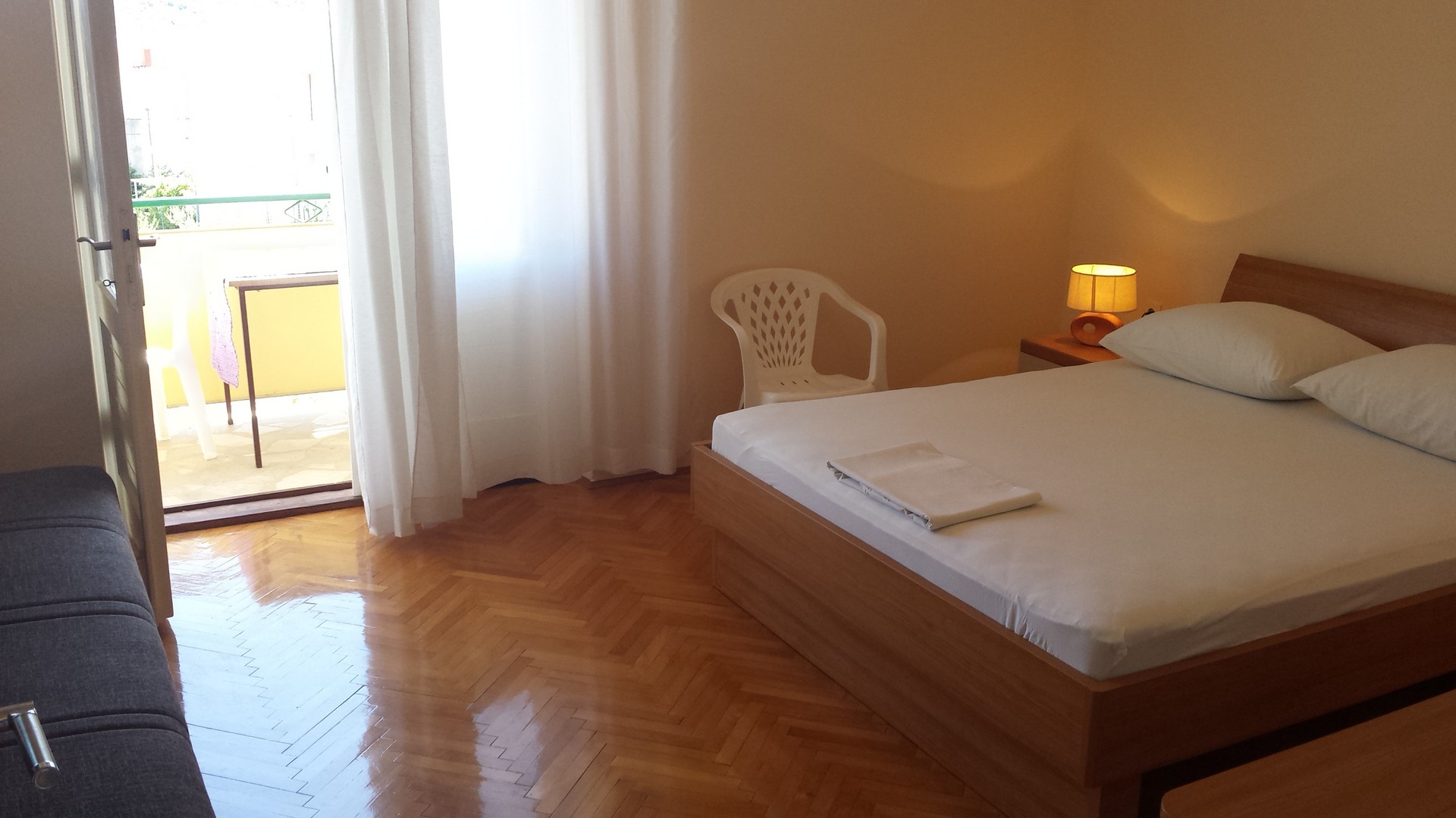 Zimmer mit Doppelbett und Einzelbett, Küche, Badezimmer mit WC, Balkon, Klimaanlage, TV, WLAN, Parkplatz