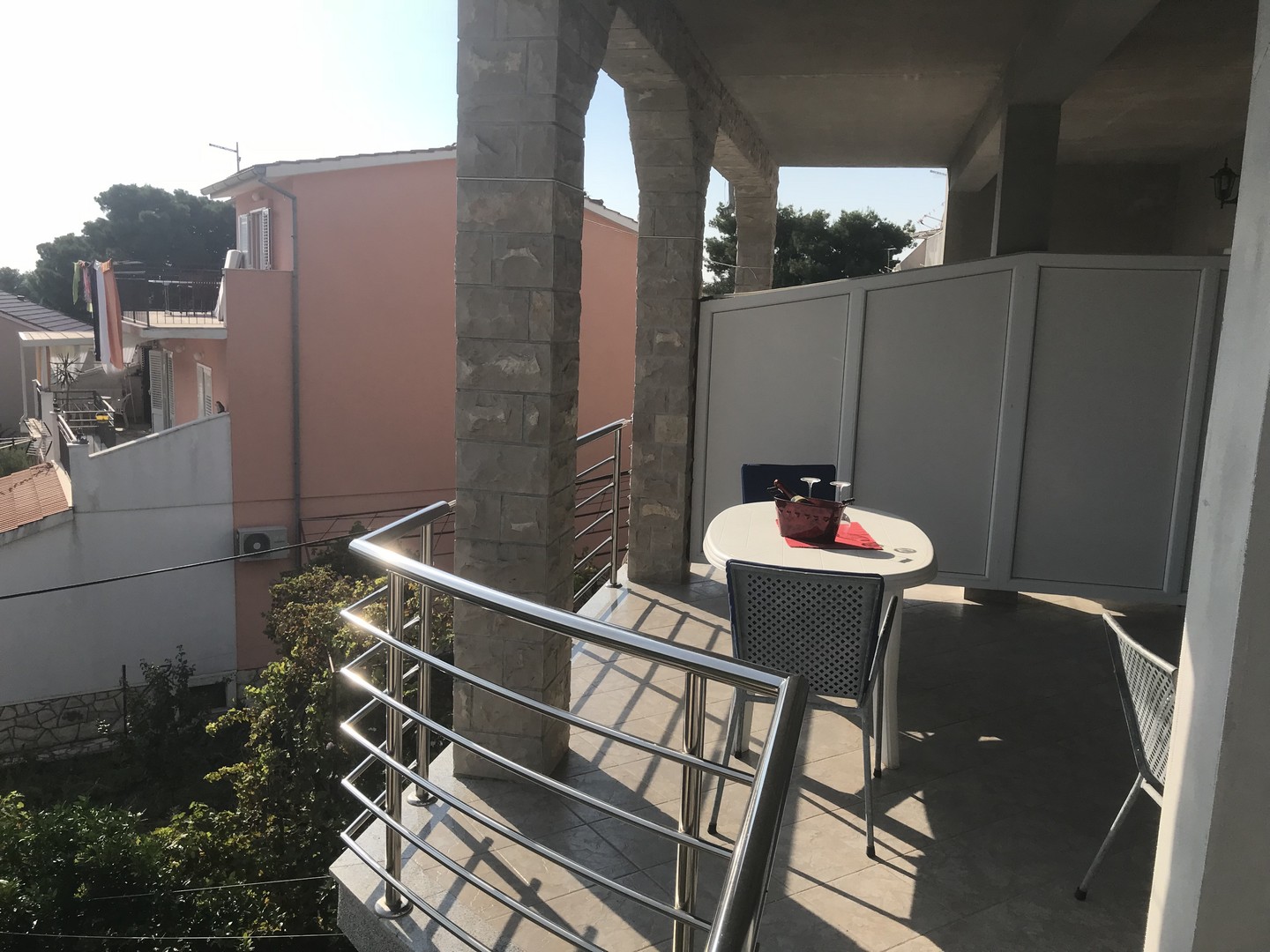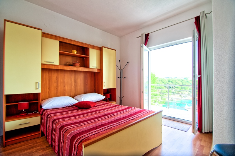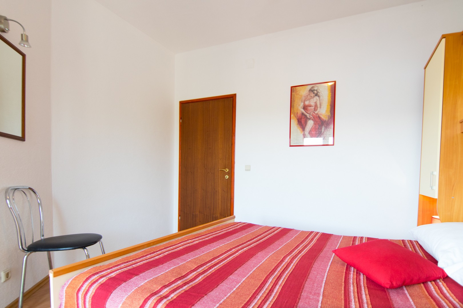 65m²; zwei Schlafzimmer, eines mit Doppelbett und das andere mit zwei Einzelbetten, die zu einem großen verbunden werden können; Küche mit Essbereich und Wohnzimmer mit Schlafsofa, Badezimmer mit WC, Balkon, Klimaanlage, Sat-TV, WLAN, erster Stock, Parkplatz