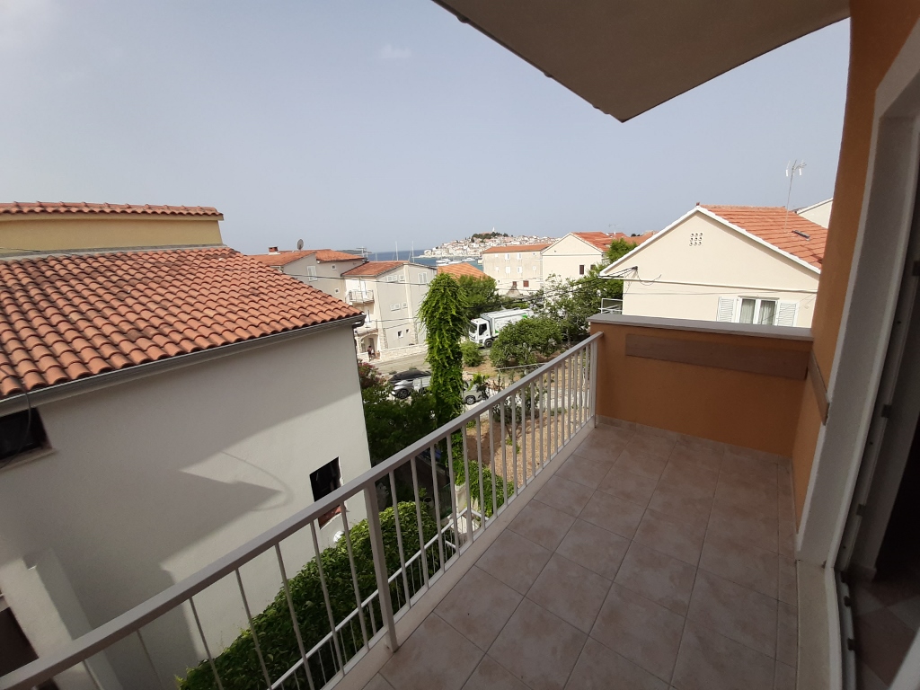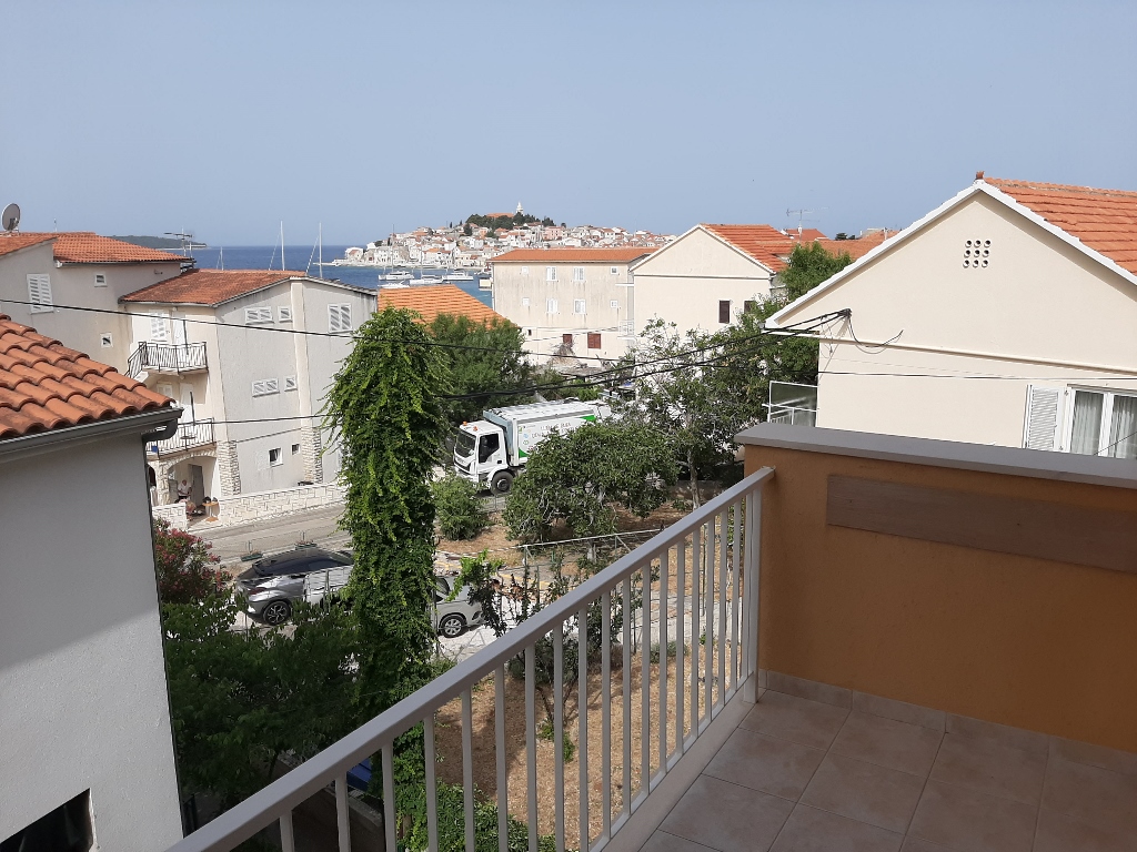 Balkon mit Blick auf das Meer und einen Teil der Altstadt von Primosten.