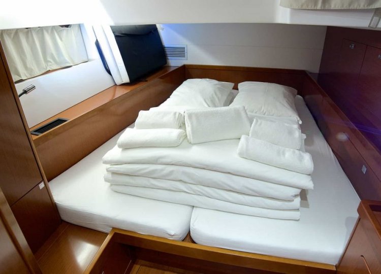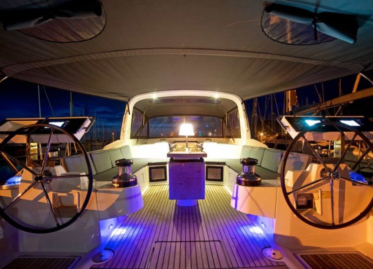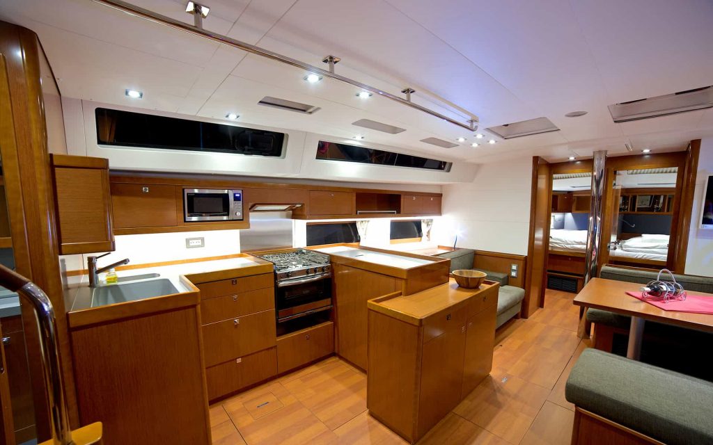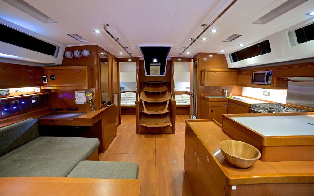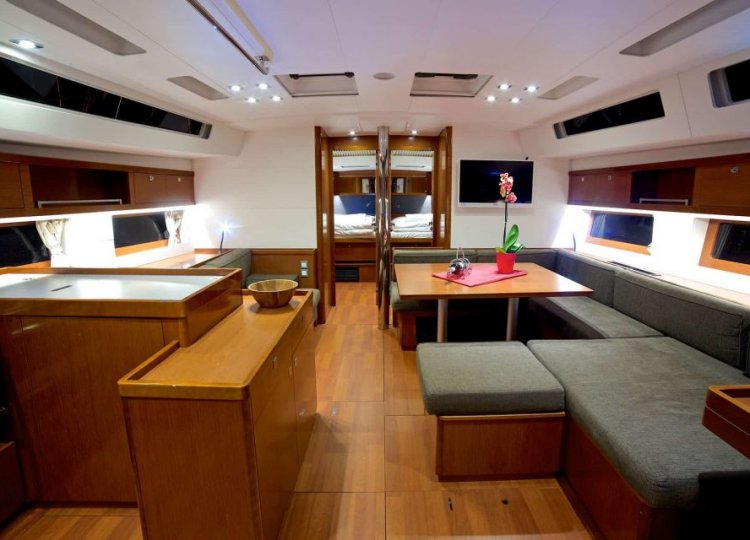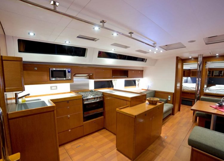 L'intérieur se caractérise par de nombreuses ouvertures qui en font une cuisine fraîche, lumineuse et spacieuse, bien équipée d'innovations design, accueillante et ultra-confortable. Quatre cabines principales plus la cabine du skipper, chacune avec sa propre salle de bain, donnent une sensation de sérénité, de fraîcheur et de calme. Les invitations spéciales à la détente sont quatre grandes zones de bronzage ainsi qu'une plate-forme arrière qui se transforme en terrasse au bord de l'eau. L'équilibre entre un design convivial, des lignes tendues et un caractère immédiatement identifiable procure une sensation de navigation intense à ne pas manquer.