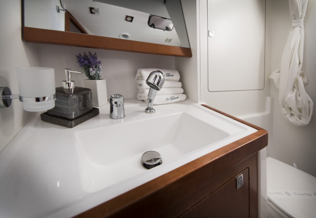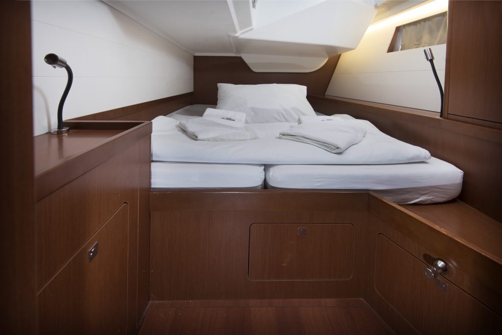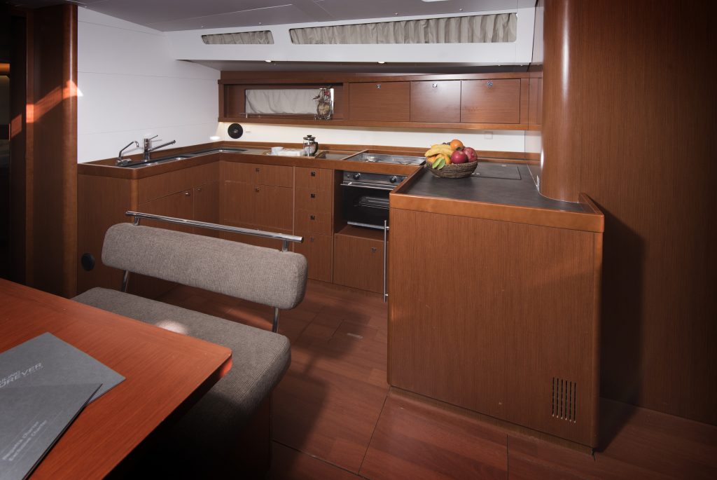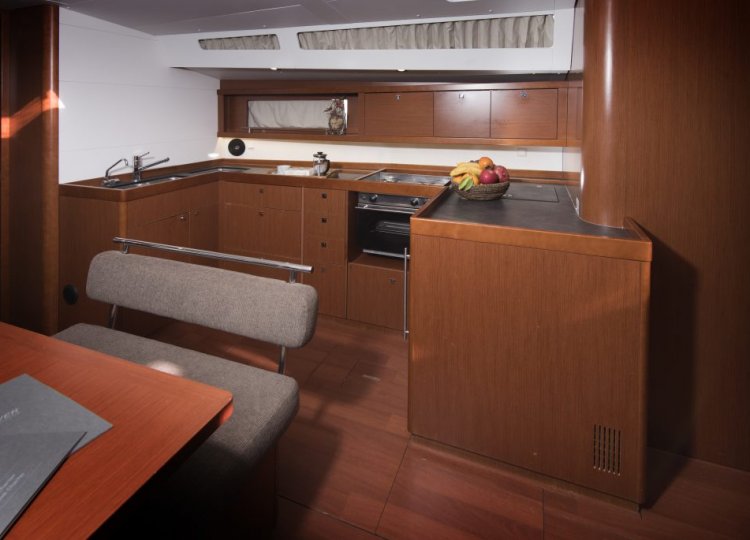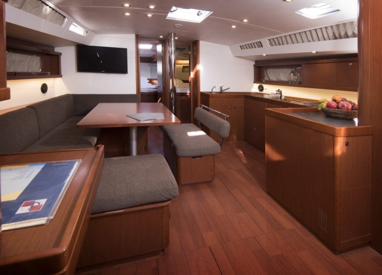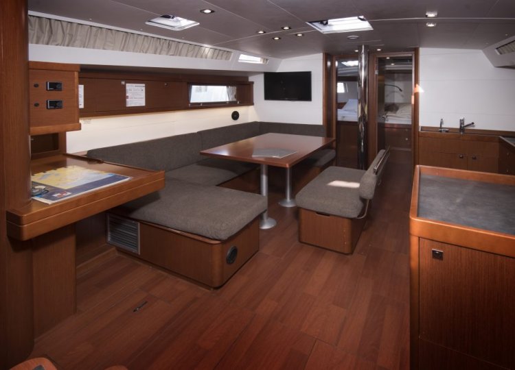 Interijer ima 5 kabina i 3 WC-a koji su definirani modernim dizajnom s beskrajnim linijama. Mnoštvo otvora stvara protok svjetlosti i zraka koji samo dočarava prostranost širokog otvorenog interijera koji se može pohvaliti prekrasnim drvenim detaljima i nježnim bojama. S dvije kabine s bračnim krevetom u prednjem dijelu i dvije kabine u krmi, Oceanis 48 i dalje ne čini ustupke u prostoru ili funkcionalnosti.