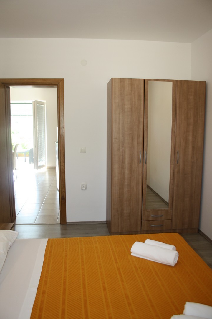 dvije spavaće sobe s bračnim krevetima, kuhinja s dnevnim boravkom, pomočni ležaj za dvije osobe, kupatilo s wc-om, terasa, klima, Tv, Wi-Fi, parkirno mjesto, udaljeno 250m od plaže i 400m od centra