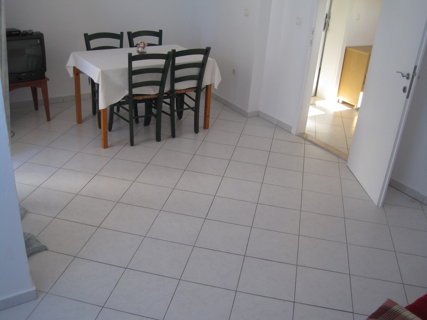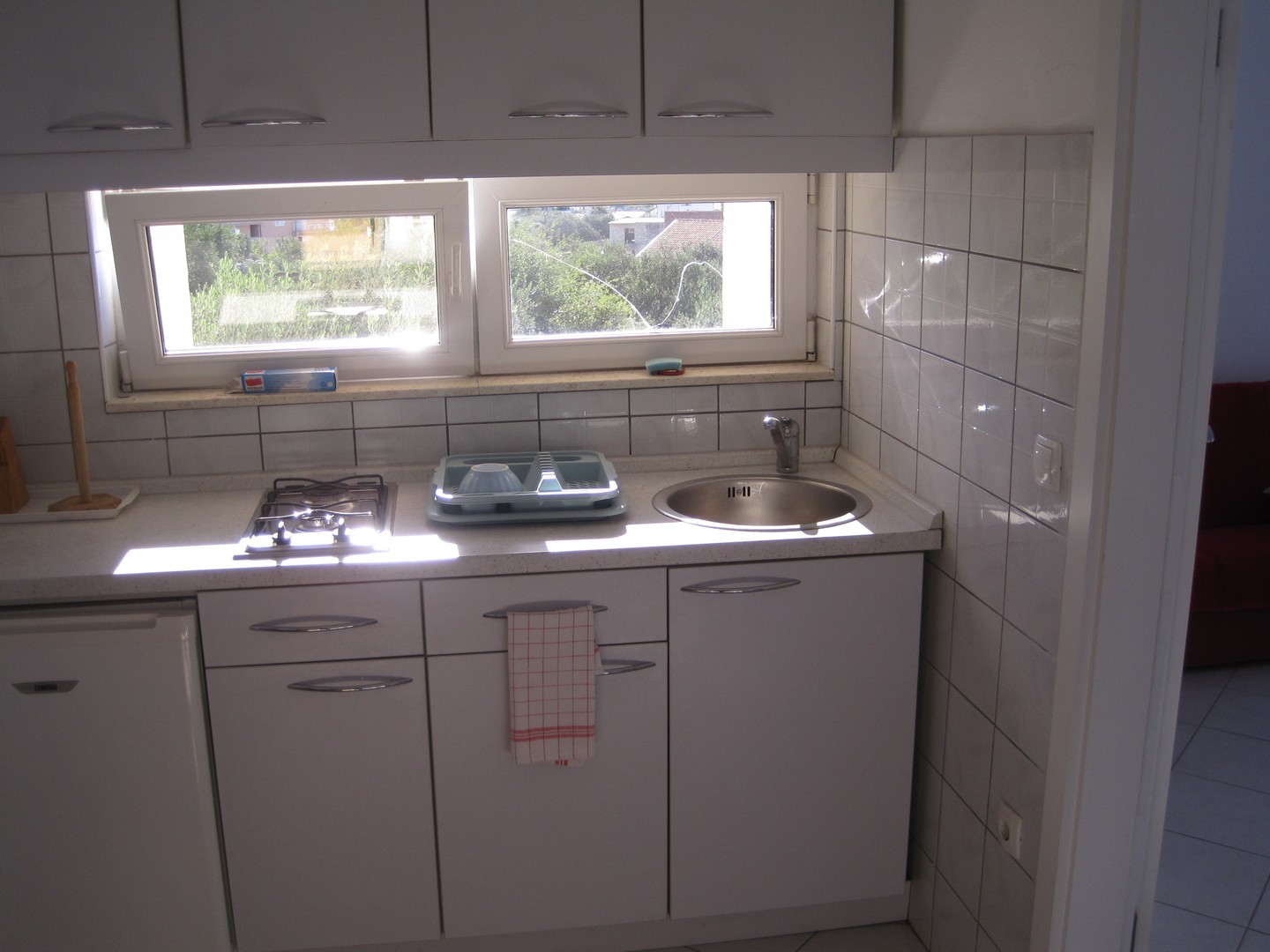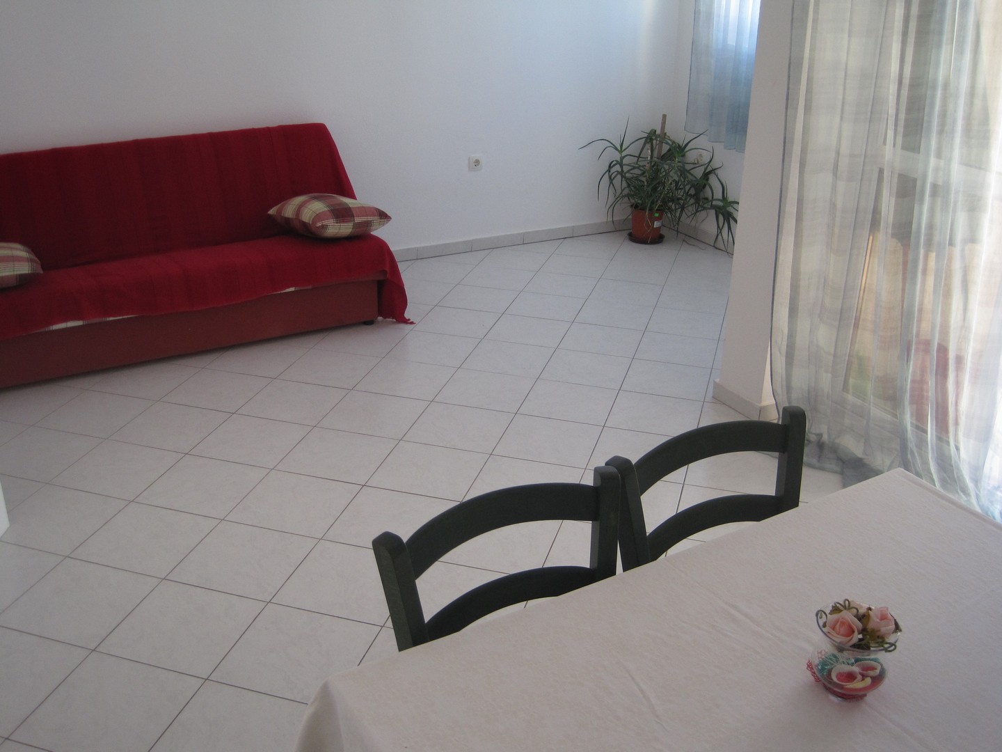 TV, cca 400 m od mora i plaže i cca 400 m od centra, balkon sa malim pogledom na more, kuhinja, 2 odvojene sobe za 2 osobe svaka, klima, dodatni ležaj za jednu osobu,WC-kupatilo, prvi kat, parking