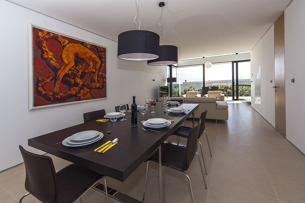 Dnevna soba / blagovaonica (49 m2), SA T / LCD TV, otvara se na terasu (20 m2, djelomični pogled na more). Otvorena kuhinja (štednjak s keramikom s 4 prstena