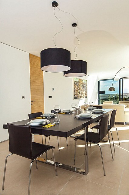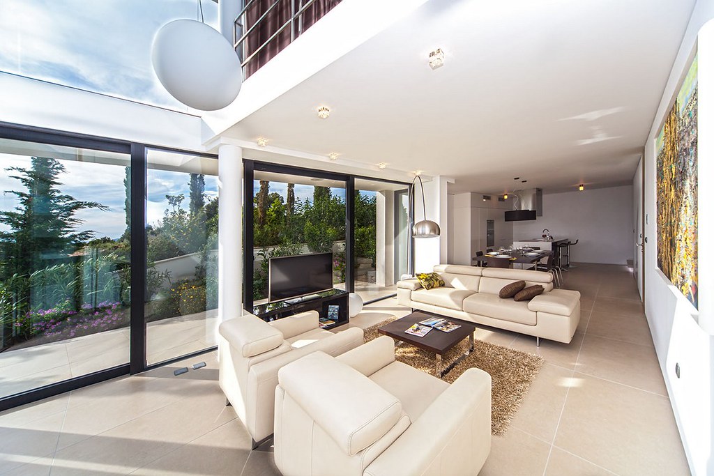 Dnevna soba / blagovaonica (49 m2), SA T / LCD TV, otvara se na terasu (27 m2, djelomični pogled na more). Otvorena kuhinja (štednjak sa keramičkom plocom s 4 prstena, pećnica, zamrzivač, mikrovalna pećnica, perilica posuđa). Odvojeni wc.
