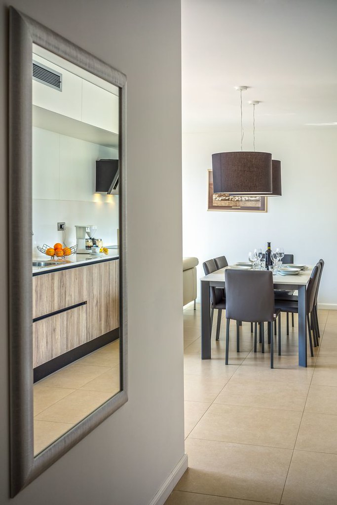 Dnevna soba / blagovaonica, SAT / LCD TV otvara se zelenom vrtu maslina (djelomični pogled na more). Otvorena kuhinja (štednjak s keramičkom plocom s 4 prstena, pećnica, zamrzivač, mikrovalna pećnica, perilica posuđa, perilica rublja). Dvije kupaonice s tušem i WC-om.