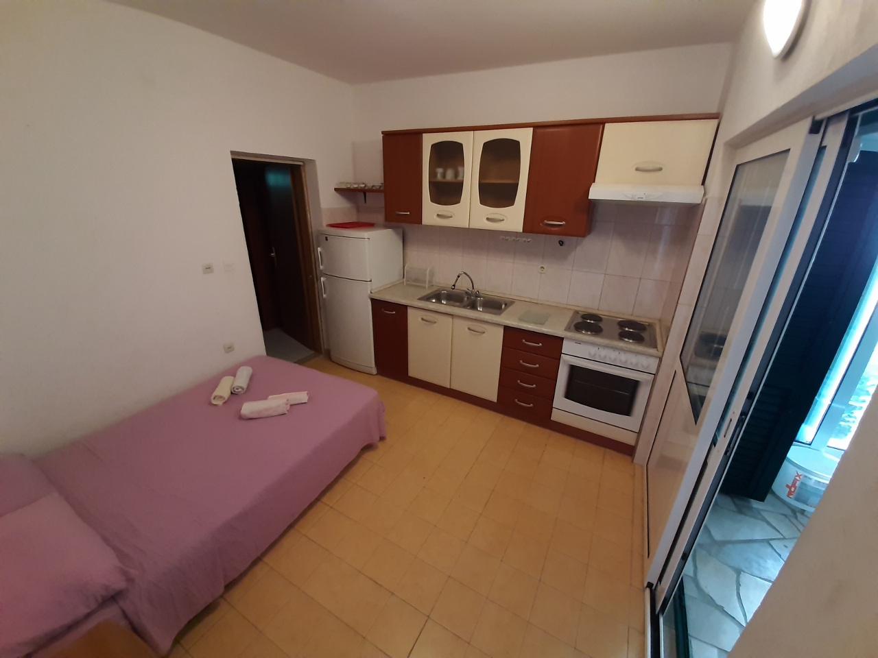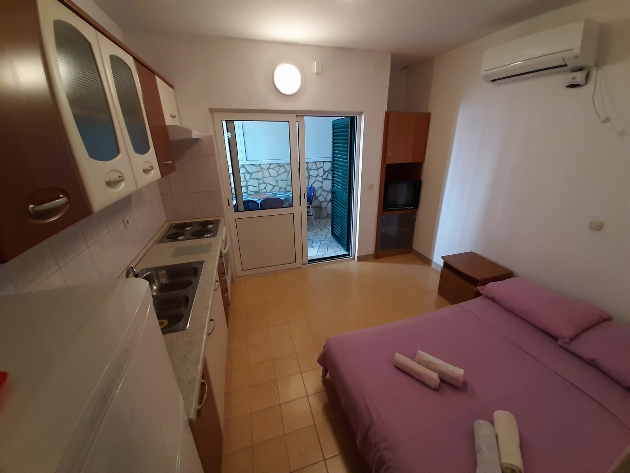 Apartman od cca 28 m2 sa terasom. Okrenut indirektno prema moru. Mali pogled na more sa terase. Udaljen cca 15 m od plaže. Parking i korištenje vanjskog grilla. Klima, TV, wi-fi.