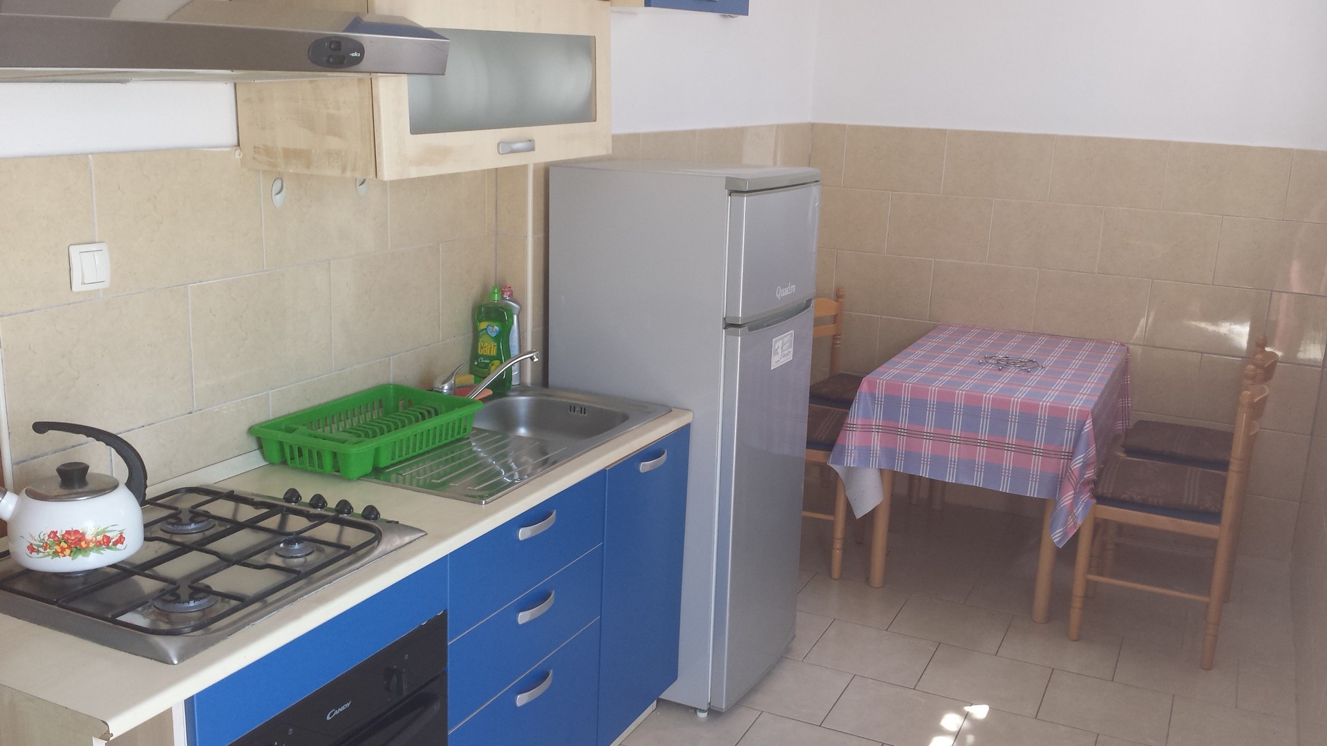 Sypialnia z podwójnym łóżkiem, pokój dzienny z dwoma dodatkowymi łóżkami dla jednej osoby, kuchnia, łazienka z WC, balkon, klimatyzacja, TV, WiFi, drugie piętro, parking