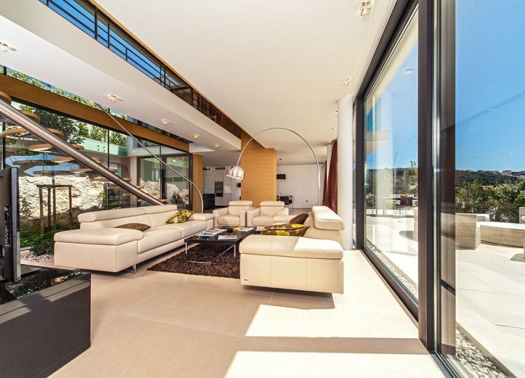Parter: duży salon, jadalnia (111 m2), TV SAT / LCD, otwiera się na częściowo zadaszony taras (100 m2, piękne widoki na morze, zestaw do siedzenia). Otwarta kuchnia (kuchenka z czterema płytami ceramicznymi, piekarnik, kuchenka mikrofalowa, zamrażarka, zmywarka). Oddzielna toaleta. Basen zewnętrzny (częściowo zadaszony, 20 m2, głębokość 135 cm), zadaszony taras (22 m2, leżaki), sauna z prysznicem. Sprzęt fitness: rower halowy, bieżnia. Schody wewnętrzne