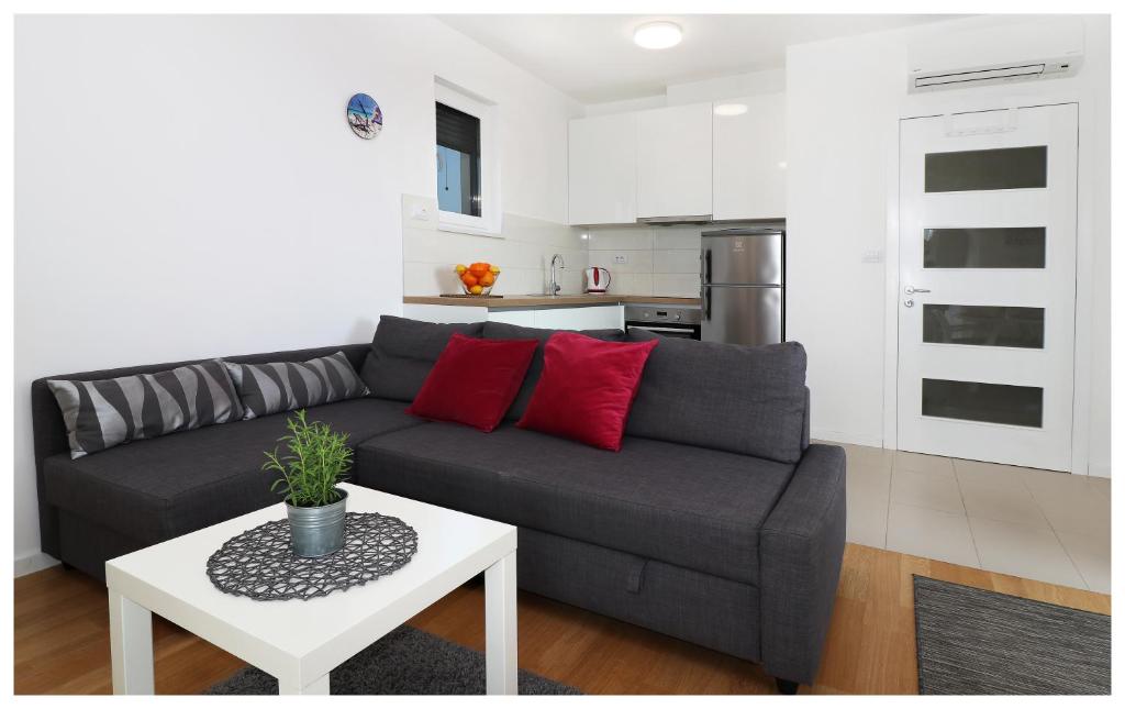 This apartment on the 2nd floor has a balcony overlooking the sea and the town of Primosten. Includes a living room with a sofa bed and a kitchen with a dining area. The private bathroom includes a bathtub and washing machine. The apartment area is approximately 46 m2. Separate air conditioning in each unit.