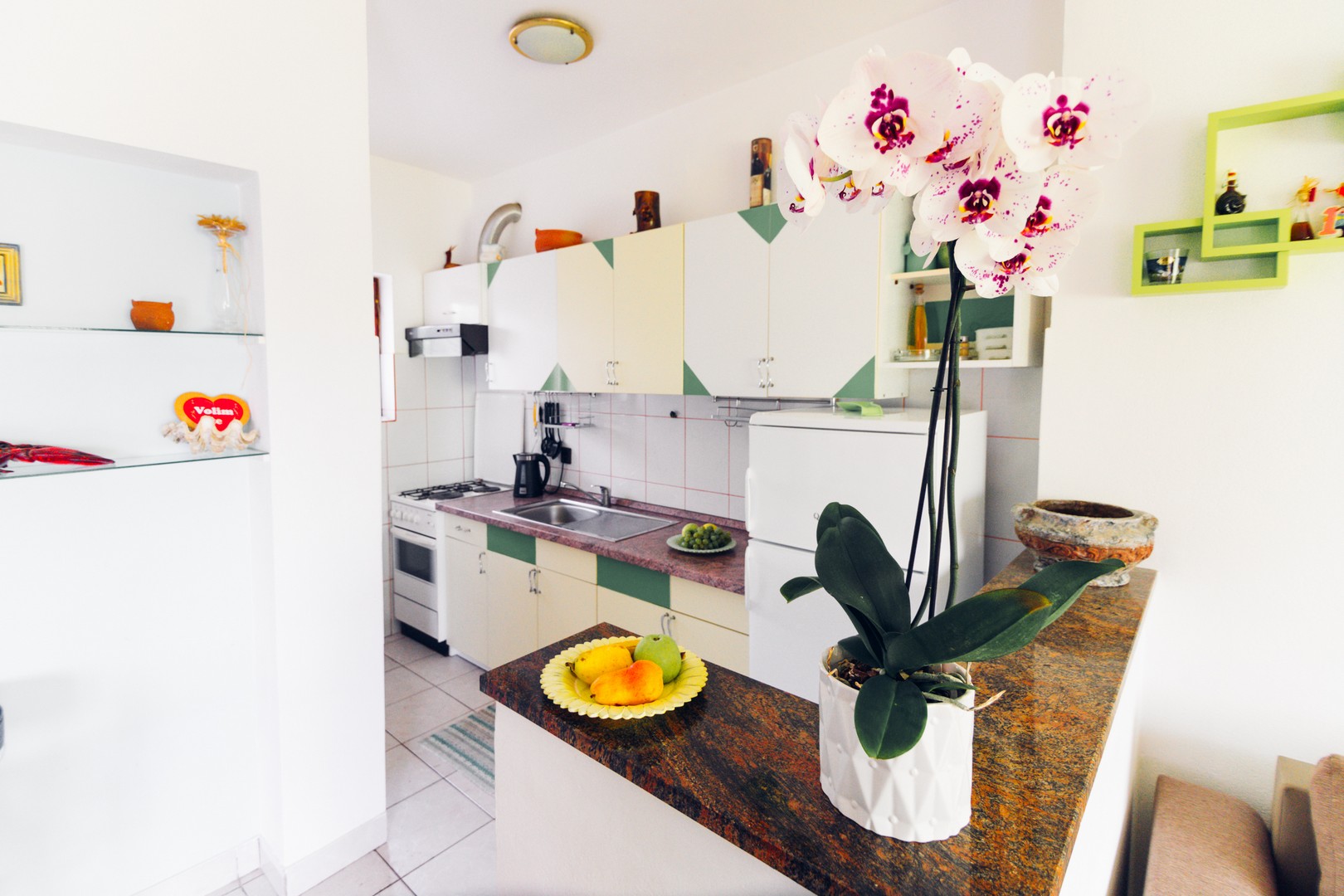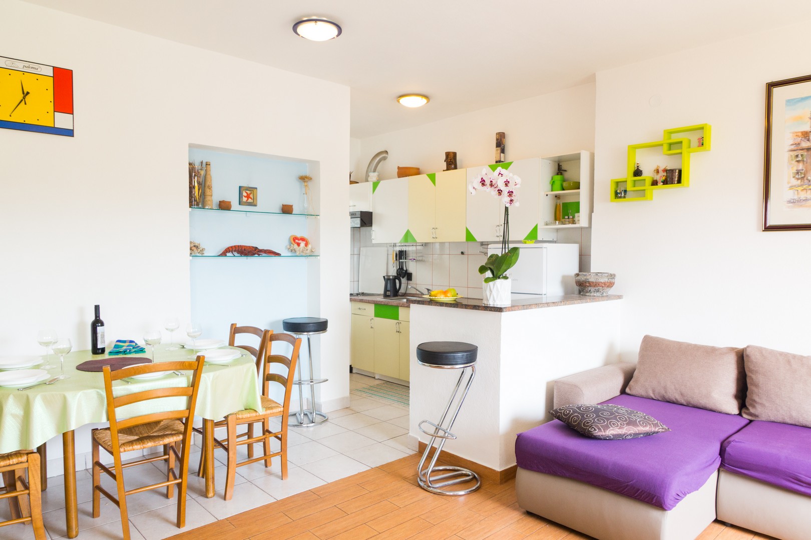 110m²; three bedrooms, two with double beds and one with two single beds; Living room with sofa bed, kitchen with dining area; two full baths, large terrace, air conditioning, satellite TV, wifi, high ground floor, parking