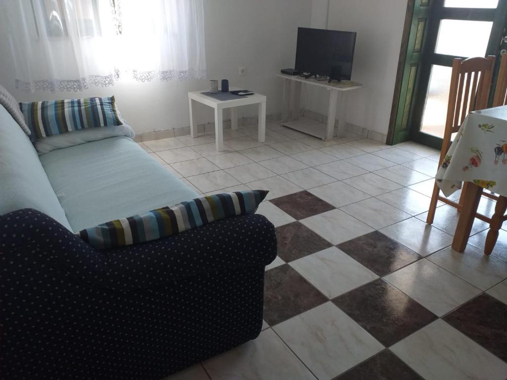 Chambre à coucher avec lit double, cuisine avec coin repas et salle de séjour avec canapé-lit, salle de bain avec WC, balcon, TV, parking