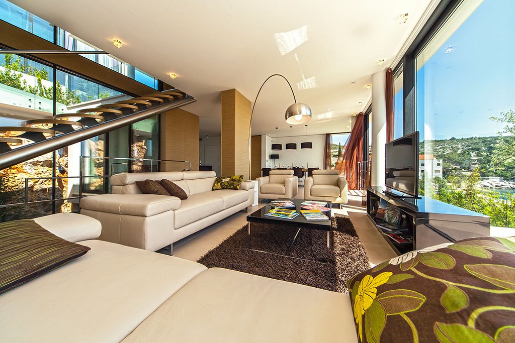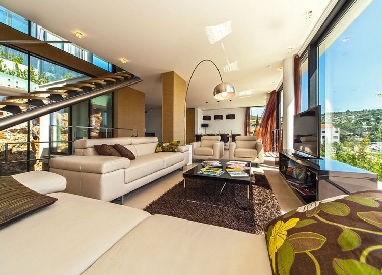 Rez-de-chaussée: grand salon, salle à manger (131 m2), TV SAT / LCD, sortie sur la terrasse (35 m2, belle vue mer, salon). Cuisine ouverte (cuisinière avec 4 plaques de cuisson, plaque vitrocéramique, four, micro-ondes, congélateur, lave-vaisselle), ouvre sur terrasse (15 m2, mobilier d'extérieur). Toilettes séparées.