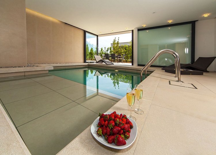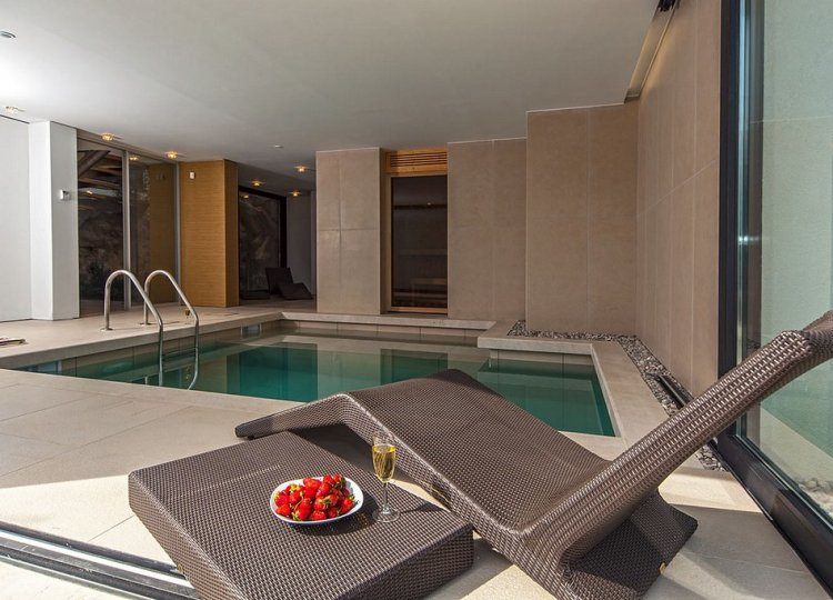 Niveau inférieur: piscine intérieure (16 m2, profondeur 20-130 cm, nage à contre-courant), ouvre sur la terrasse (35 m2, transats). Sauna avec douche. Équipement de fitness: vélo d'intérieur, banc de musculation. Atrium avec verdure.