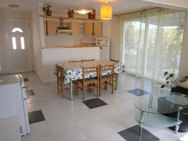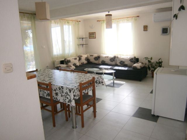 80m²; Tri odvojene spavaće sobe s bračnim krevetima, kuhinja s blagovaonicom i dnevni boravak s kaučem na razvlačenje, kupaonica s WC-om, jedan zaseban WC, terasa, klima uređaj, TV, wi-fi, parkirno mjesto.