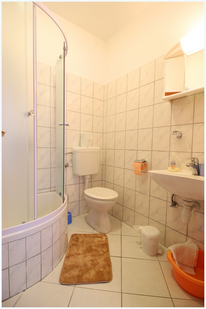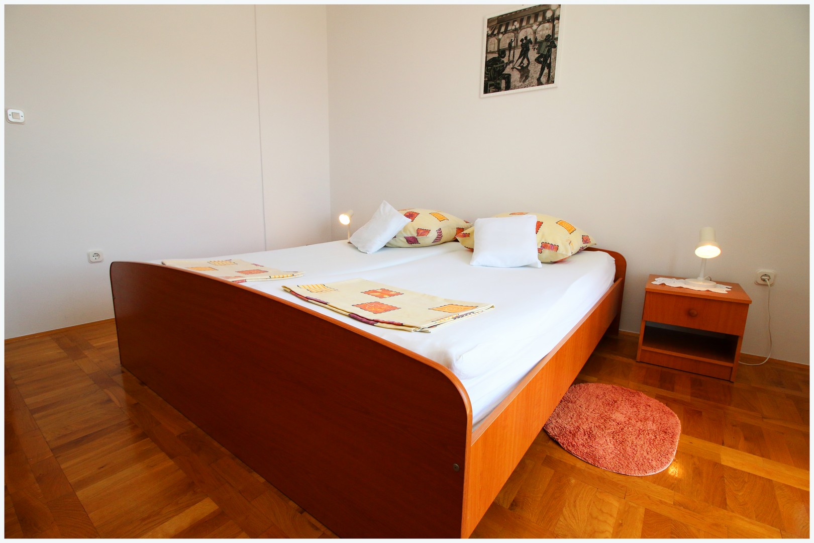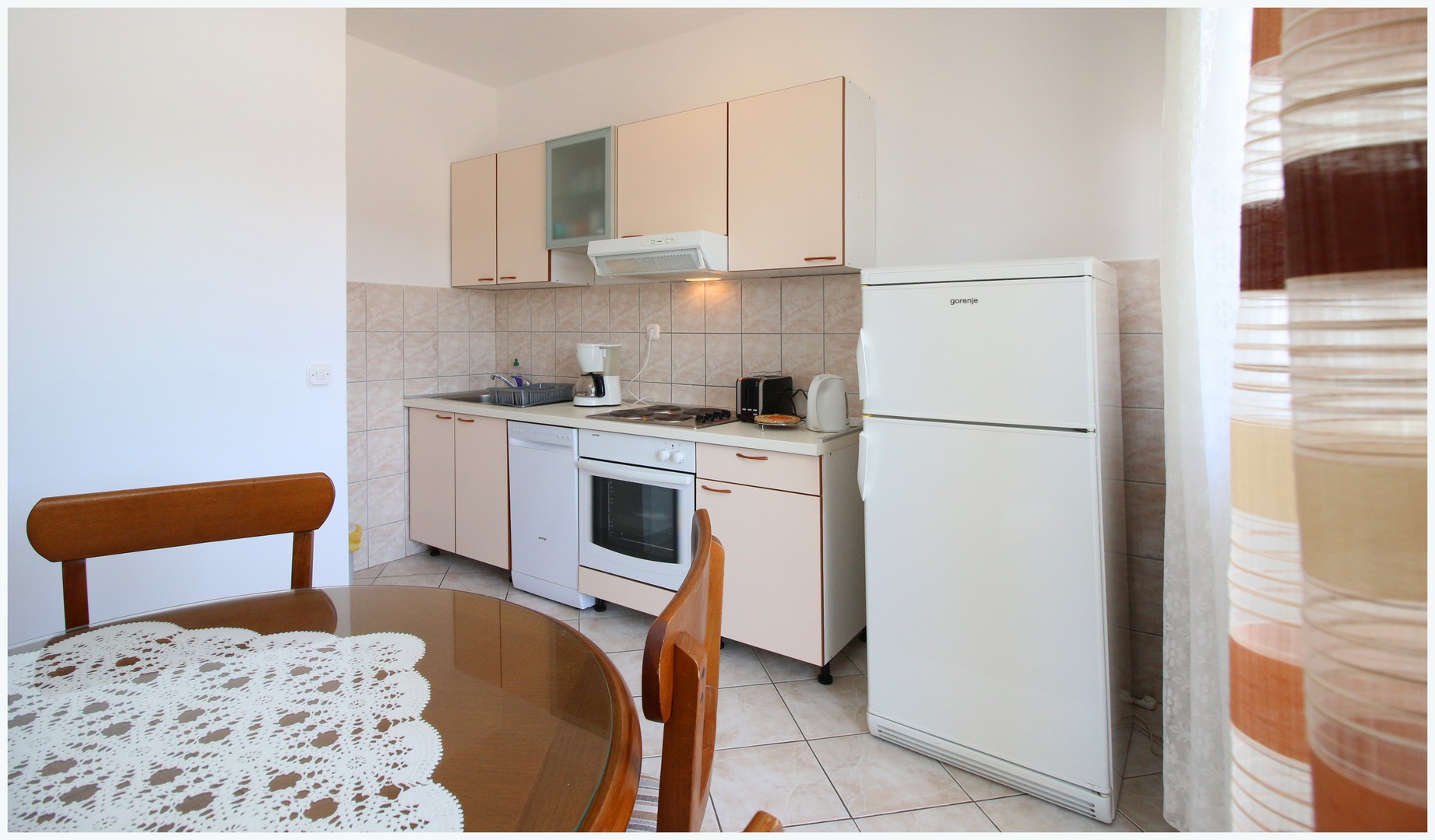 75 m²; dvije spavaće sobe s bračnim krevetima, dnevni koravak s kaučem na razvlačenje i krevetom za jednu osobu, kuhinja s blagavaonicom, dvije kupaonica s WC-om, balkon, klima uređaj, TV, wi-fi, parkirno mjesto