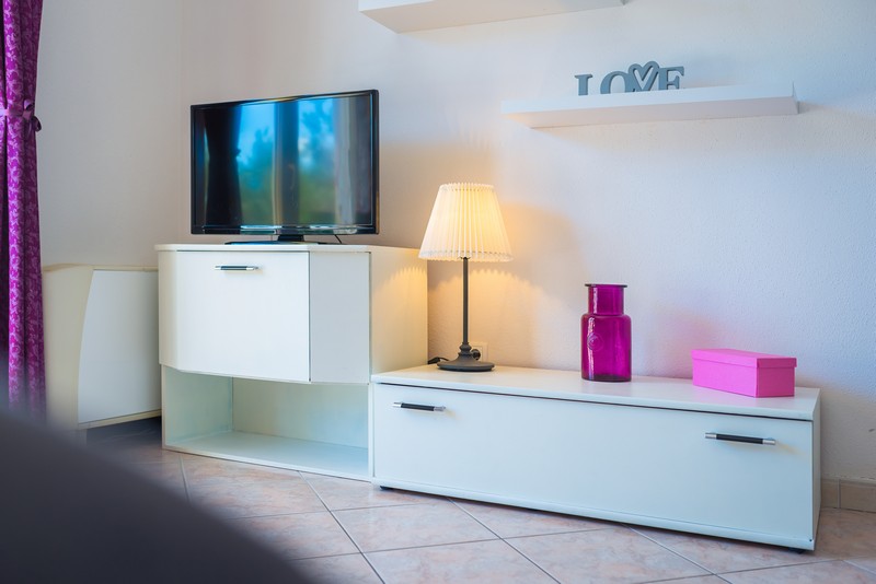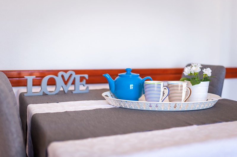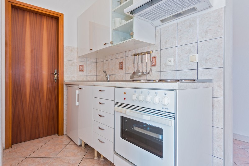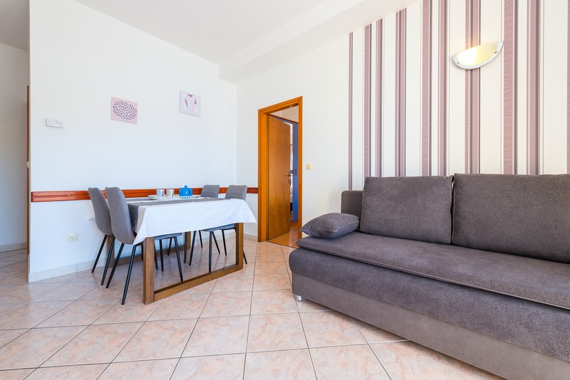Apartman 2+2 nalazi se na prvom katu, a sastoji se od jedne spavaće sobe, kuhinje, dnevne sobe s kaučem na razvlačenje za dvije osobe (160x200), kupaonice i balkona s pogledom na more. Kuhinja je opremljena posuđem za kuhanje i posluživanje.