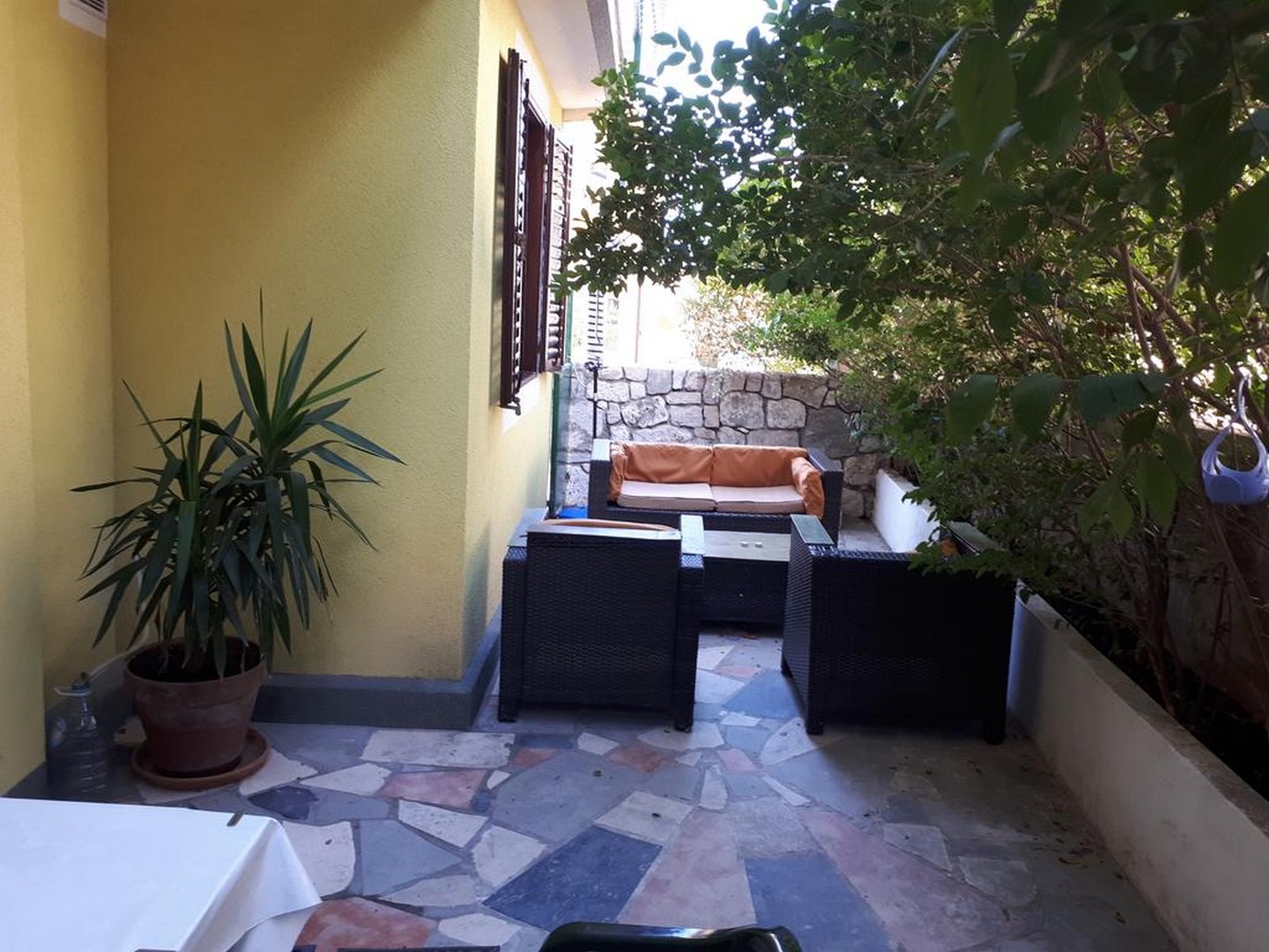 Apartman s terasom cca. 200 m od mora i cca. 300 m od centra Primoštena, dvije sobe sa bračnim krevetima, kuhinja, kupaonica s WC-om, klima, Sat-TV, Wi-Fi, prizemlje, parking