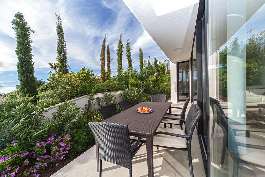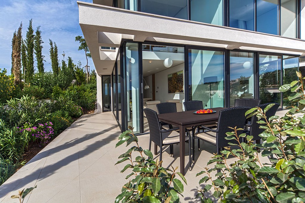 Dnevna soba / blagovaonica (49 m2), SA T / LCD TV, otvara se na terasu (27 m2, djelomični pogled na more). Otvorena kuhinja (štednjak sa keramičkom plocom s 4 prstena, pećnica, zamrzivač, mikrovalna pećnica, perilica posuđa). Odvojeni wc.
