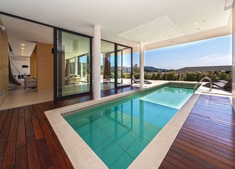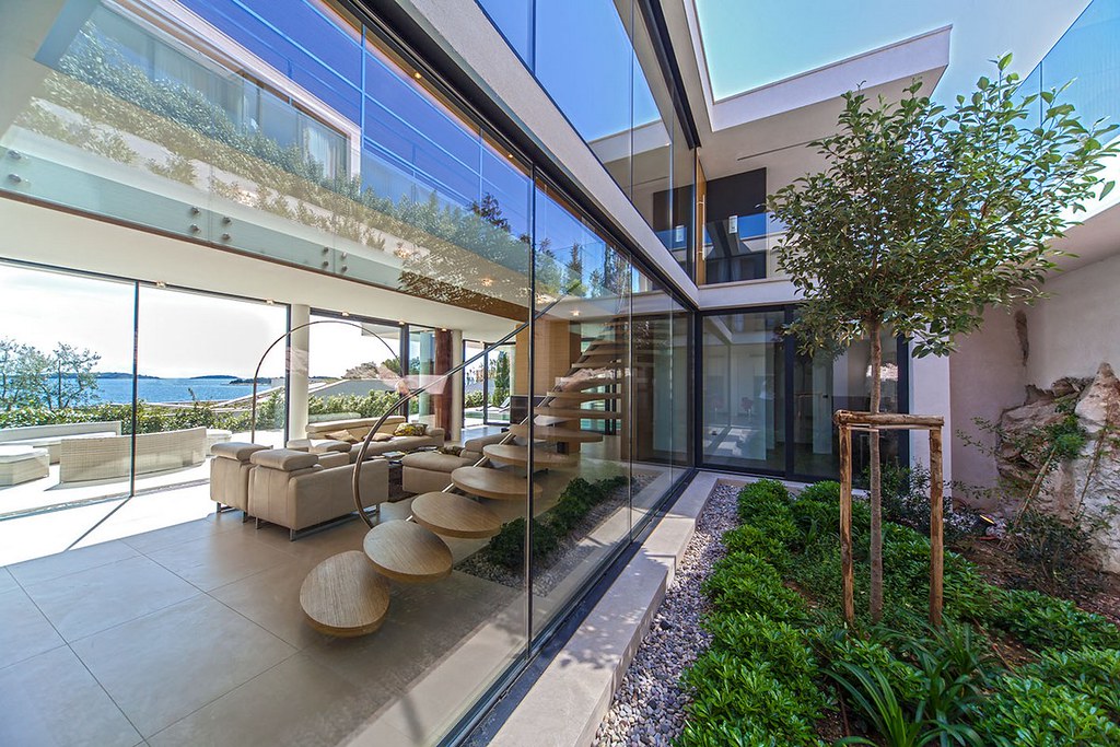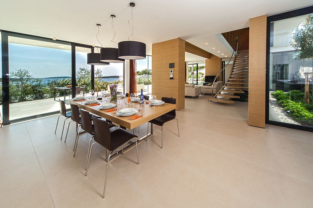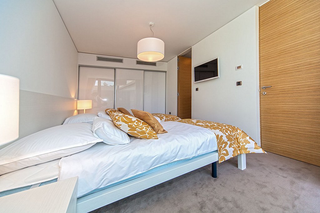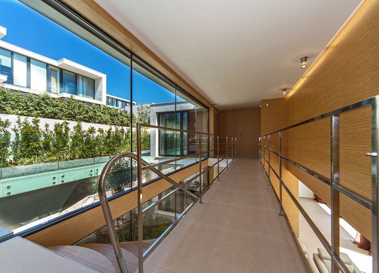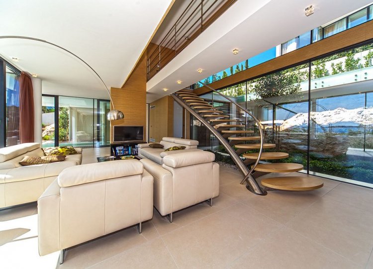Piano terra: ampio soggiorno, sala da pranzo (111 m2), TV satellitare / LCD, si apre su una terrazza parzialmente coperta (100 m2, splendida vista sul mare, set da salotto). Una cucina aperta (una cucina con quattro fuochi in vetroceramica, un forno, un forno a microonde, un congelatore, una lavastoviglie). Una toilette separata. Una piscina all'aperto (parzialmente coperta, 20 m2, profondità 135 cm), una terrazza coperta (22 m2, sedie a sdraio), una sauna con doccia. Attrezzature per il fitness: bici da interno, tapis roulant. Scala interna.