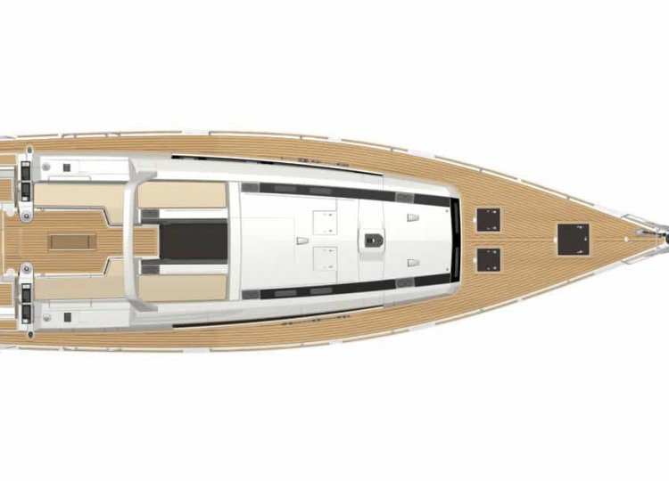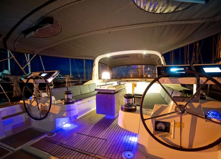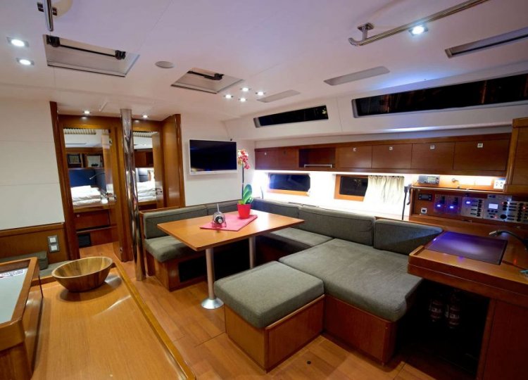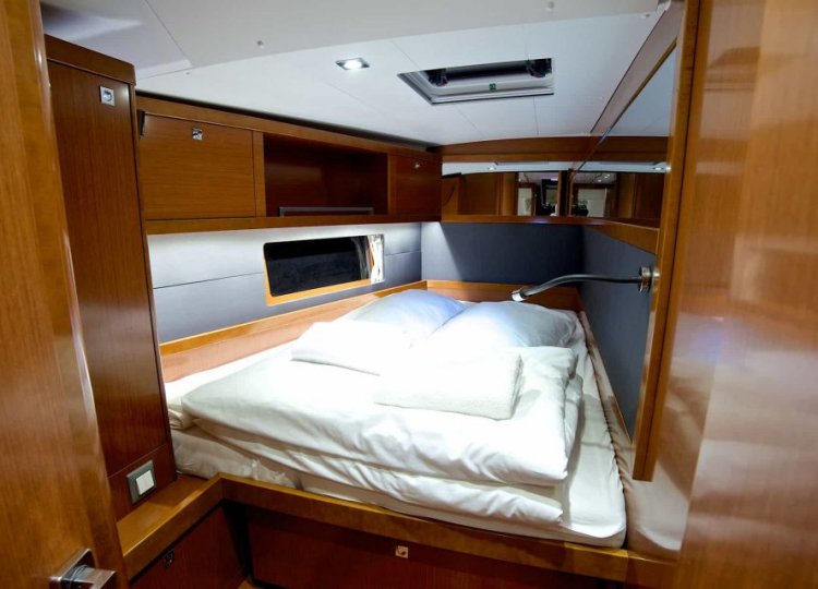 Wnętrze charakteryzuje się wieloma otworami, które sprawiają, że kuchnia jest świeża, jasna i pojemna, dobrze wyposażona w nowatorskie rozwiązania projektowe, przyjazna i niezwykle komfortowa. Cztery kabiny główne plus kabina sternika, każda z własną łazienką, dają poczucie spokoju, chłodu i ciszy. Specjalne zaproszenie do relaksu to cztery duże miejsca do opalania wraz z tylną platformą, która zamienia się w taras nad wodą.
