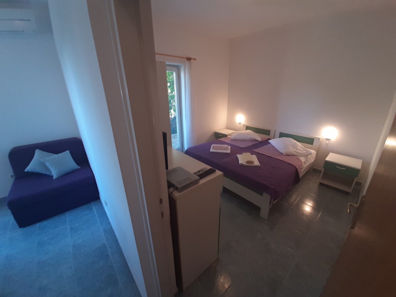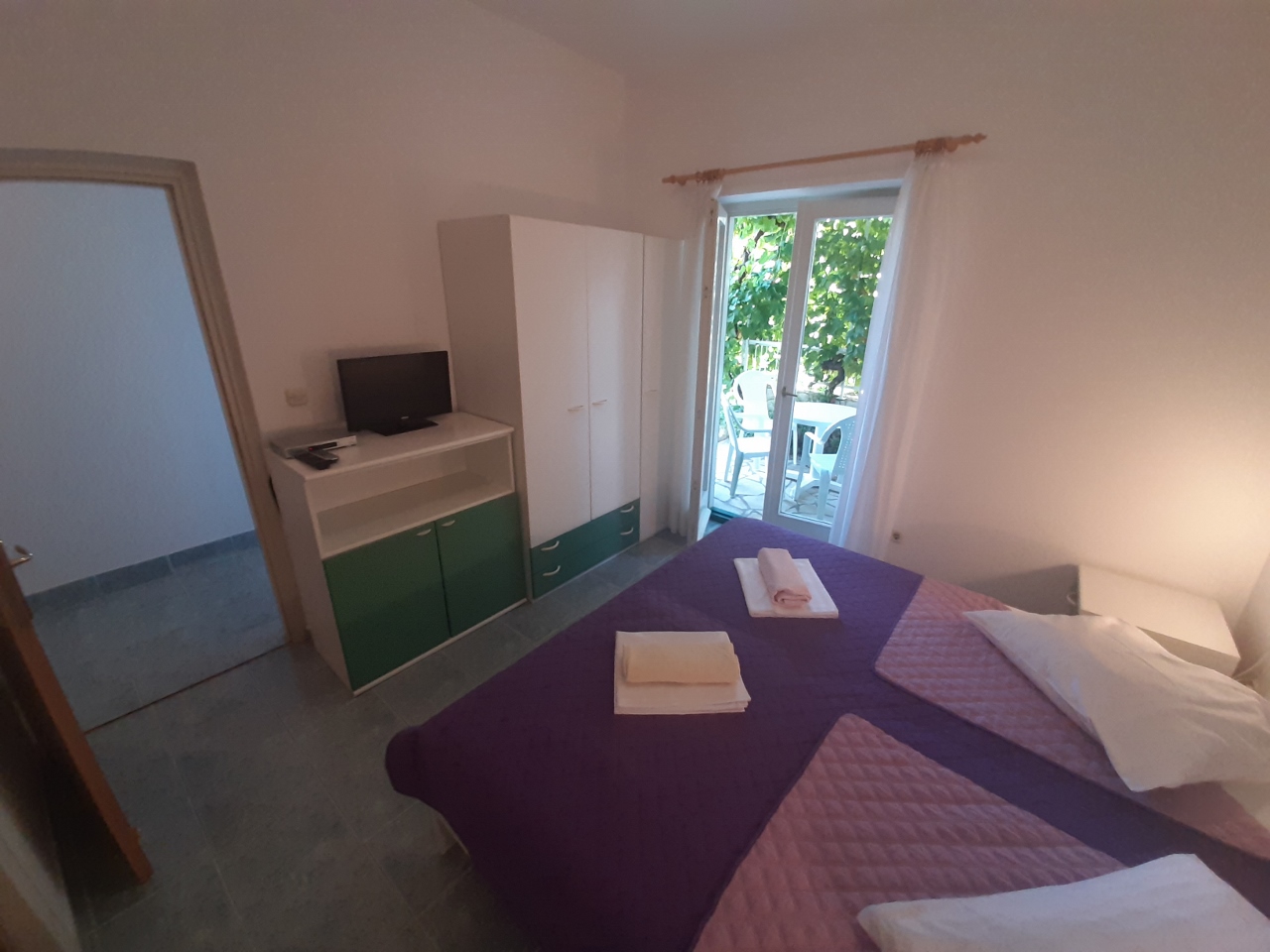 Oddzielna sypialnia z podwójnym łóżkiem i łóżkiem jednoosobowym, pokój dzienny z rozkładaną sofą, kuchnia, łazienka z WC, taras, klimatyzacja, TV, Wi-Fi, grill na świeżym powietrzu, parter, miejsce parkingowe