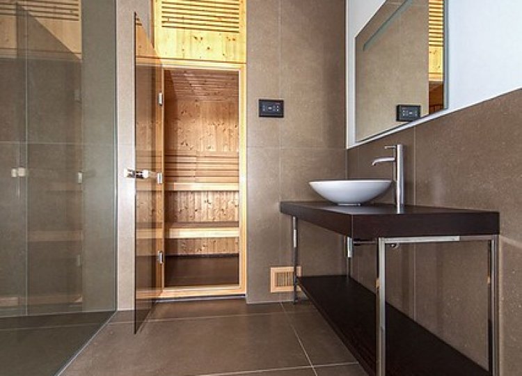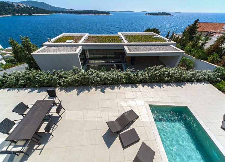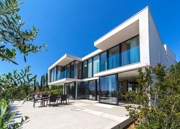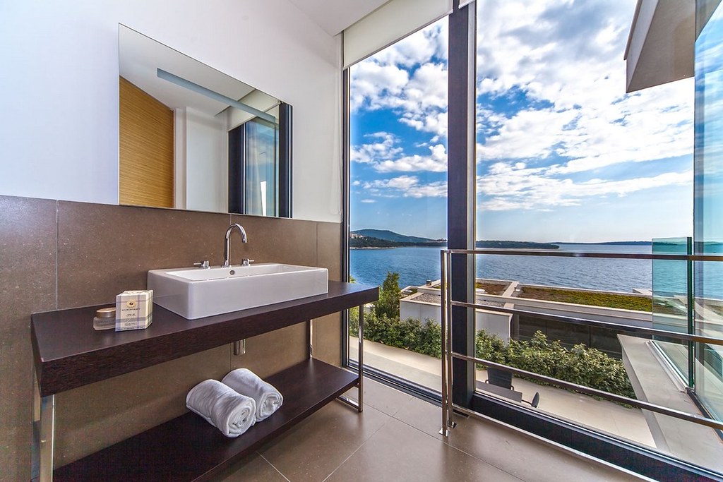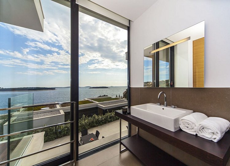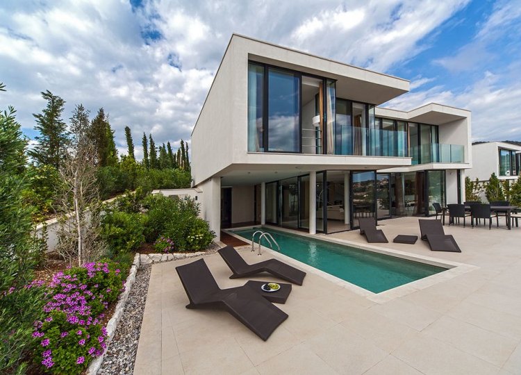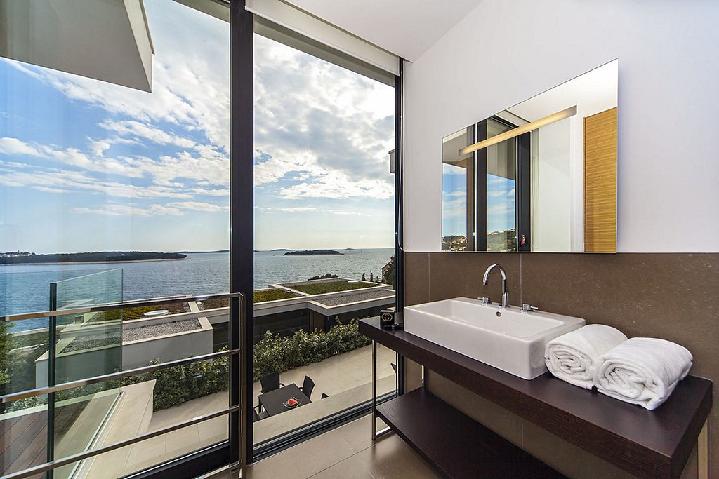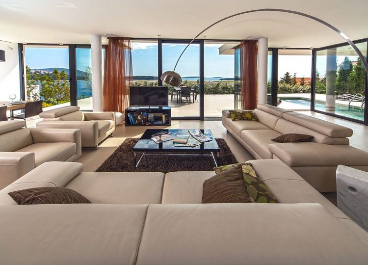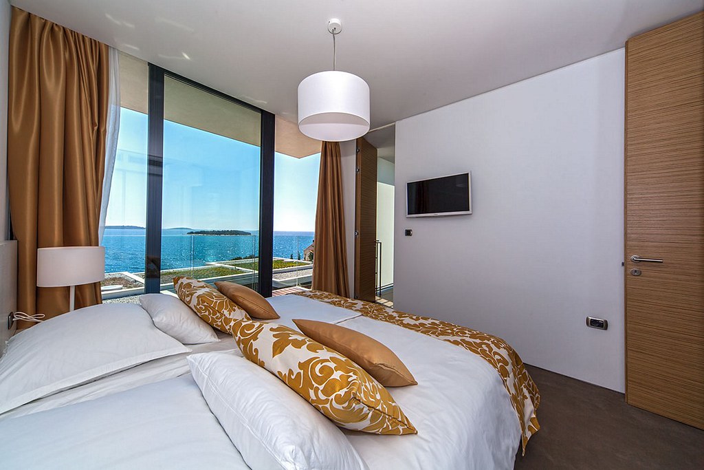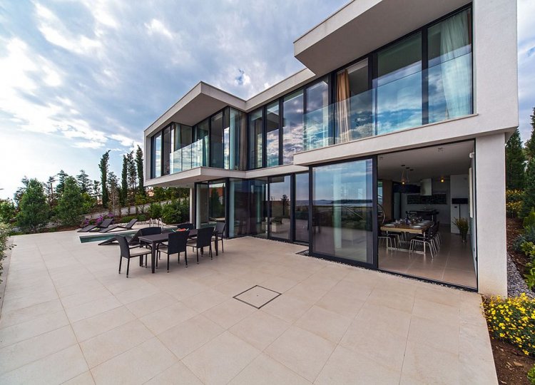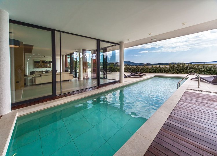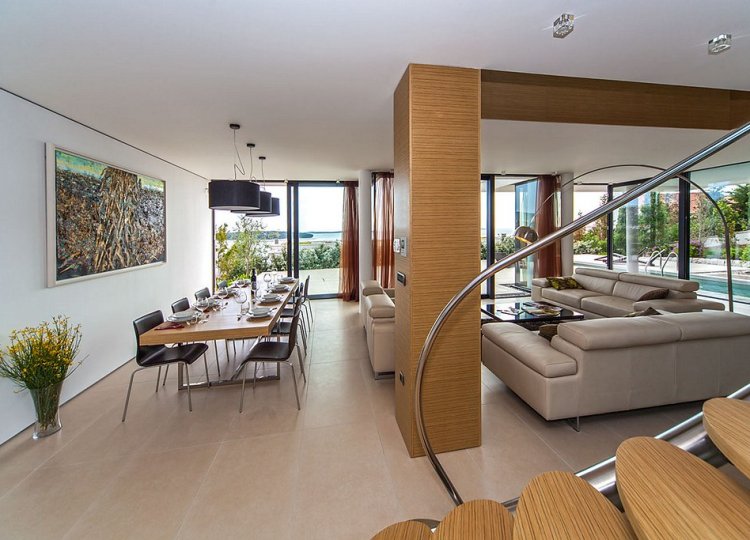 Parter: duży salon, jadalnia (105 m2), TV SAT / LCD, otwiera się na taras (82 m2, zestaw do siedzenia, widok na morze). Otwarta kuchnia (kuchenka z czteropalnikową płytą ceramiczną, piekarnik, kuchenka mikrofalowa, zamrażarka, zmywarka). Oddzielna toaleta. Odkryty basen, częściowo zadaszony (22 m2, głębokość 140 cm), sauna z prysznicem. Sprzęt fitness: rower halowy. Schody wewnętrzne