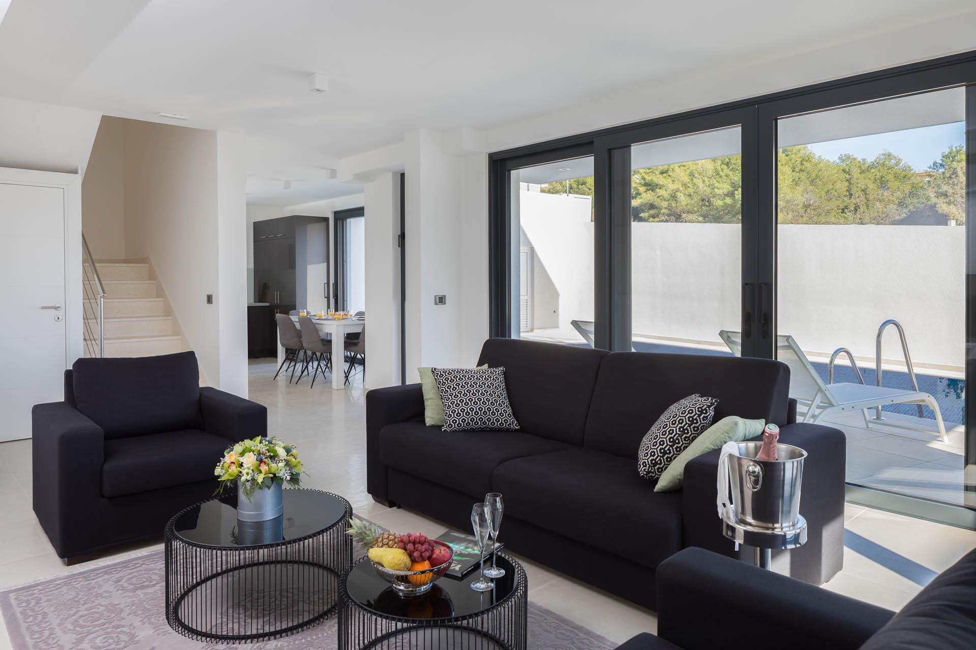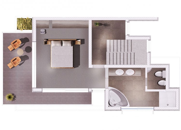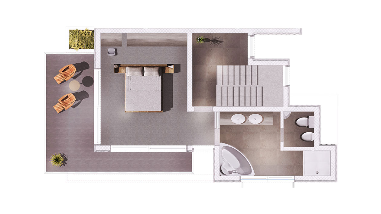 i najbliższe otoczenie. Na parterze znajduje się minimalnie wyposażona kuchnia z salonem, pełna światła dziennego i z dostępem do